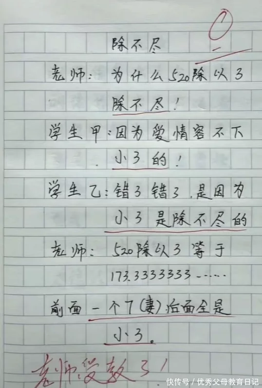 但老师最后给出了答案,说除以3等于173.333无限循环,代表除了一个妻子之后,后面都是小三,这个作文把老师给看乐了。