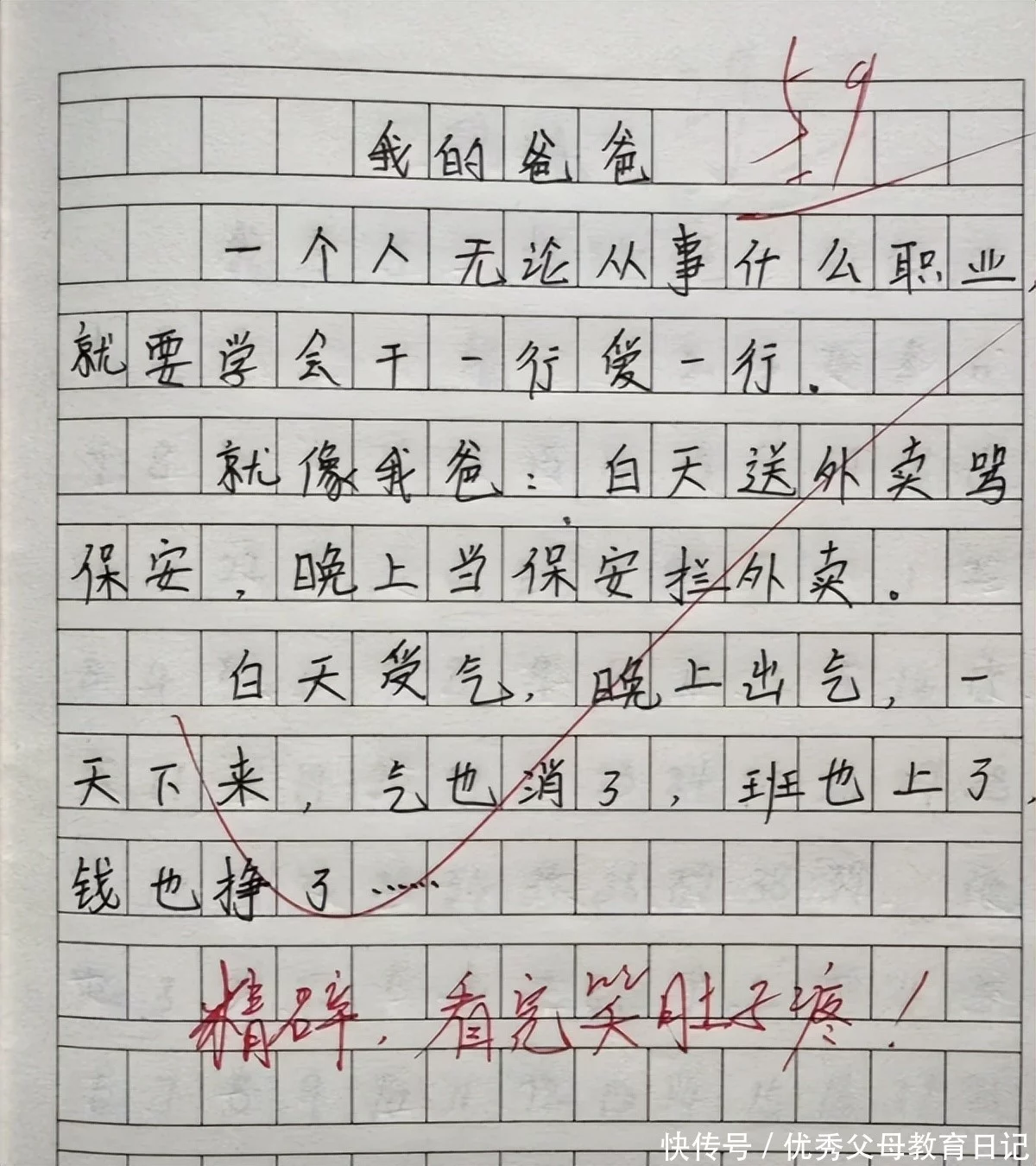 这篇作文让老师特别开心,他开篇讲述了一个人无论从事什么职业,都应该干一行爱一行,但是他的爸爸却从事了特别神奇的职业,白天送外卖需要骂保安。