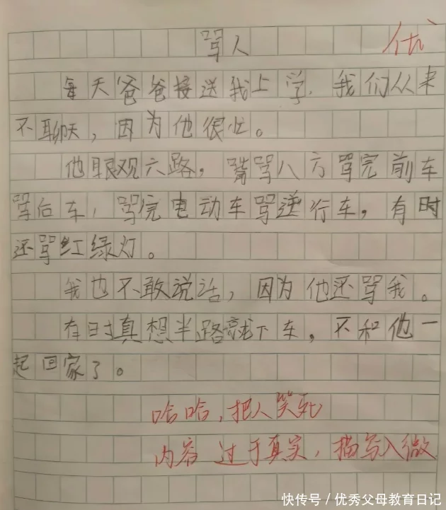 温文尔雅的形象,可是送他上学的过程中,父亲眼观六路却嘴骂八方,把前后车还有电动车、逆行车和红绿灯全部都骂了一遍,老师说一边批卷一边笑的肚子疼。